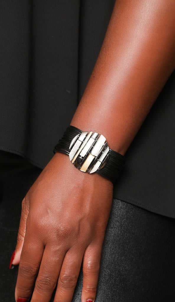 Its time to upgrade your style. Black faux leather snap bracelet with multicolored accent.