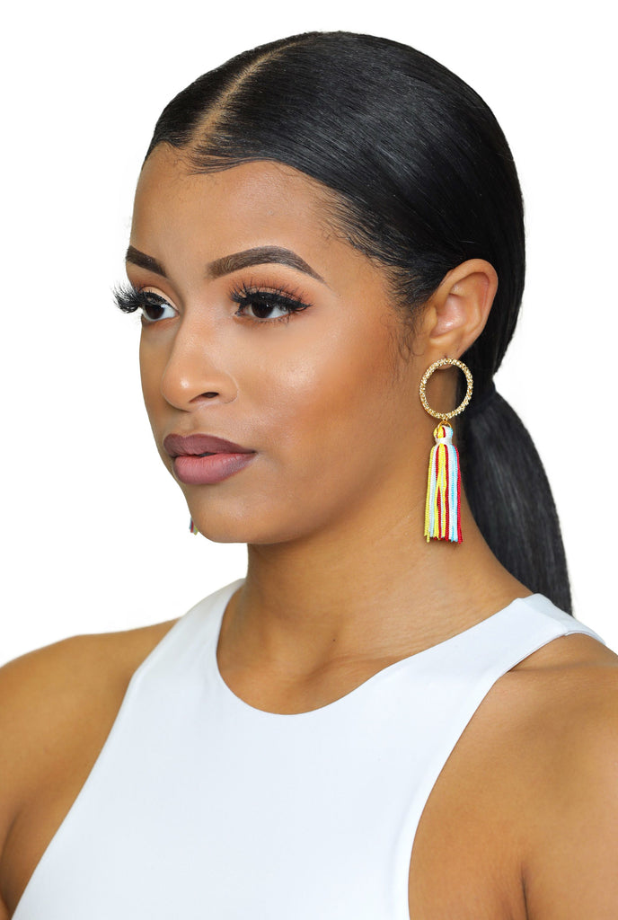 Enjoy the bold and bight tassels that so fashionably adorn these earrings. Gold circled design with flowing multi colored tassels. A look to love