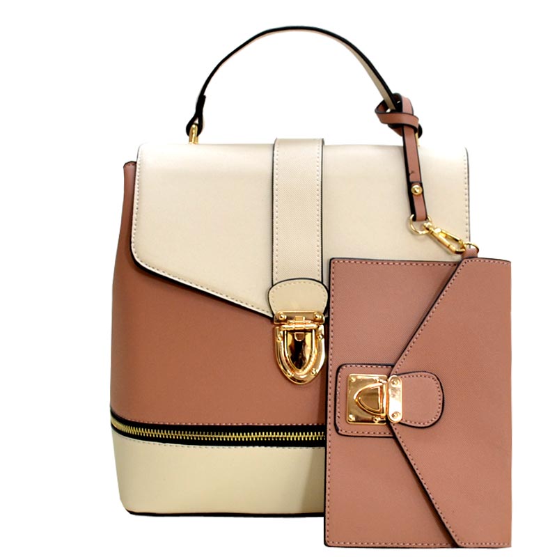 Mauve and off white color block mini faux leather backpack. Top zip clousure with rear pocket and adjustable shoulder straps. Wallet included