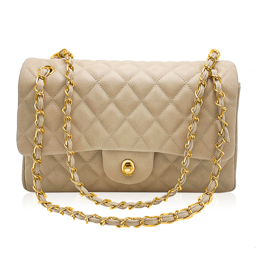 Welcome to what will be your go to handbag. Soft faux leather tan quilted handbag with braided shoulder strap outlined with gold accents. Chain strap is adjustable and will allow for cross body wear as well. This bag will not only compliment many outfits but it will hold your daily essentials. Inside slip pocket along with back pocket. Front closure.