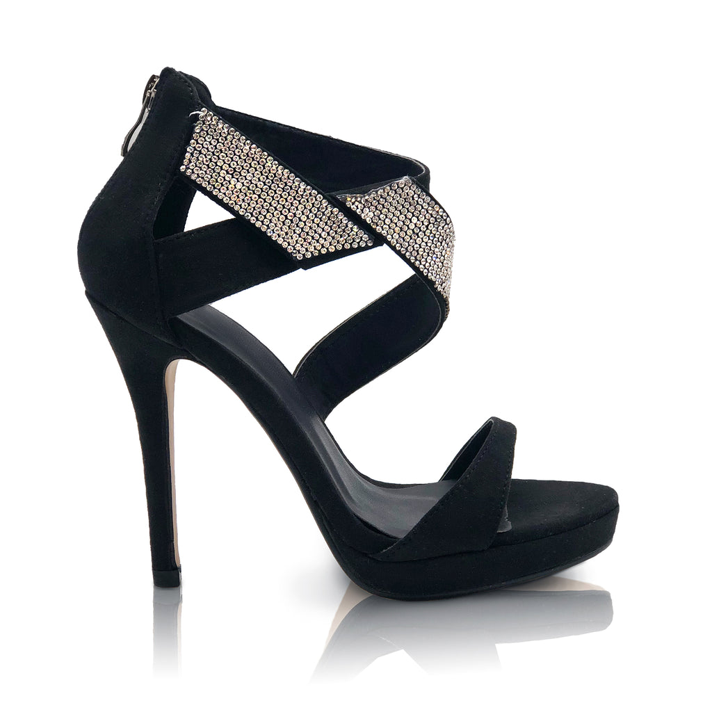 When your event screams for attention, make sure you adorn this blinged cutie. Black velvet cross front design with side bling trim will cause them to stop and stare. Easy to wear with the back zip closure and open toe design. A look to love