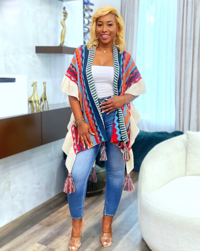 Show Me Style- Multicolor Fashion Shawl . Show up in style in this one-size-fits-all shawl amps up your look with a kaleidoscope of color. Cozy and comfy, it drapes over your shoulders with tassels swinging, perfect with jeans or that sundress. Versatility never looked so stylish!